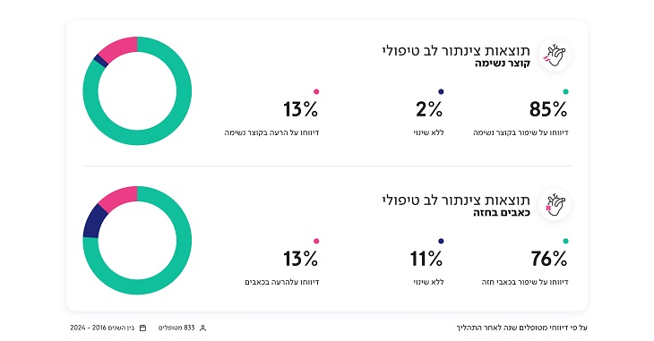 בשיבא אוספים באופן רציף נתונים ממטופלים שעברו צנתור טיפולי בשל התקף לב. הנבדקים מלאו שאלון המתייחס לתסמינים של קוצר נשימה וכאבי חזה במהלך האשפוז ובהמשך חודש, שלושה חודשים, חצי שנה ושנה לאחר האשפוז.
